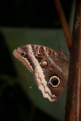 Owl Butterfly (Caligo atreus), named after the large eyespots on the closed wings