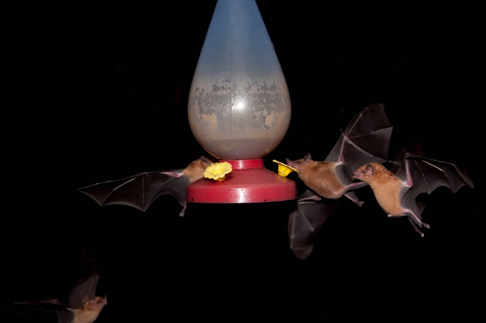 After dark, nectar-feeding bats (Carollia castanea) take over the feeders