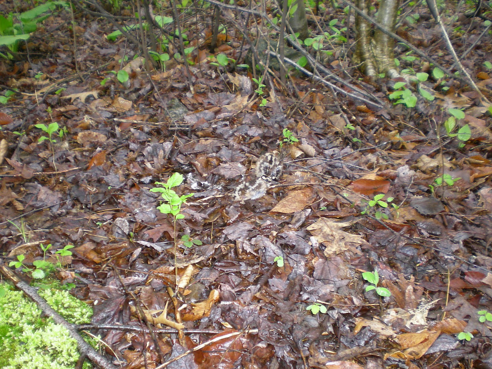 This morning I accidentally flushed a woodcock while walking along a trail in Shelton. It was in a low area near a very small, ephemeral stream which only runs right after or during spring rains. I took a look at where the bird flushed from and saw these 2 young ones. They can’t be more than a couple of days old. I didn’t get close enough to see if there were still eggs in the nest or not (they are supposed to lay 4 on average) because the mother was nearby and I know that she wanted me away from there. As I walked away, she kept flushing ahead of me to draw me farther away.