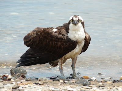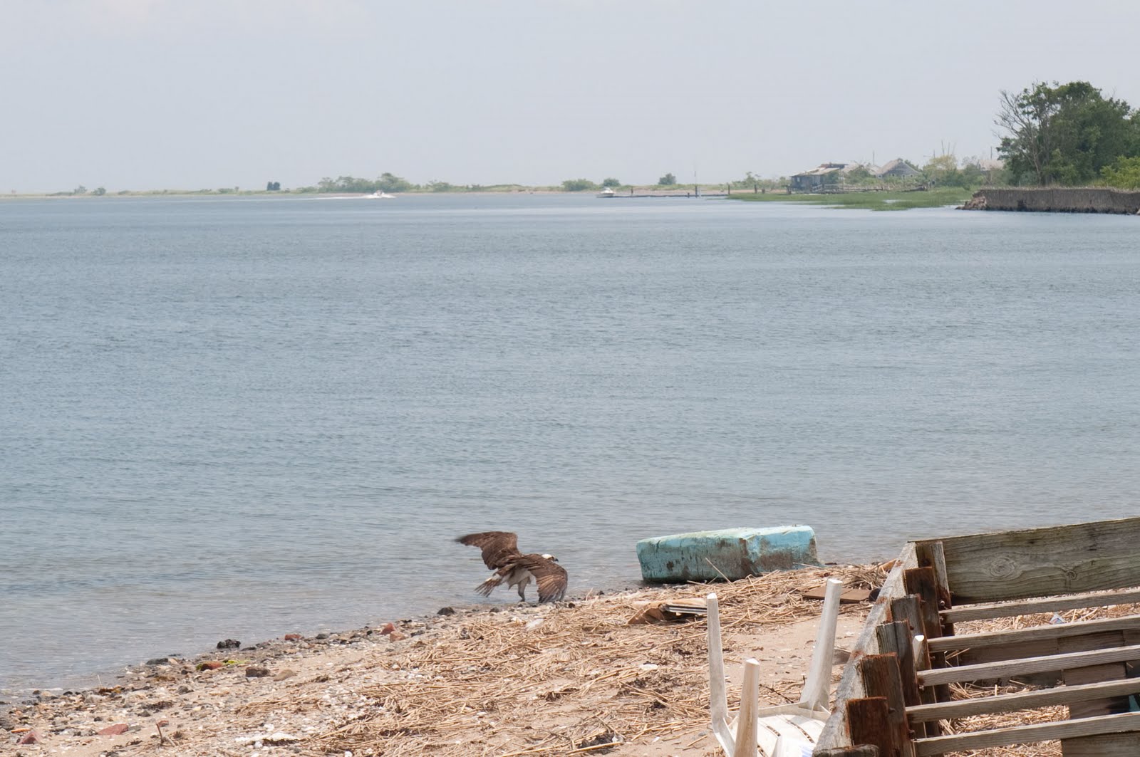 Once we reached the end of Long Beach, we got out of the car and walked down the shore facing Lewis Gut and found the Osprey in relatively short order. It was absolutely sweltering on the beach. This poor bird had suffered enough. I took the following photo and video while watching over the bird as Twan went to get the car and our needed supplies. We were definitely not wasting any time getting it to relative safety. The distant photo shows it attempting to fly – unsuccessfully.