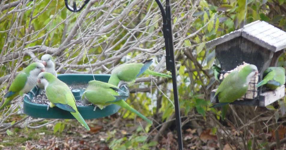 The Monk Parakeet has been classified as self-sustaining. They feed, breed, and live on their own, even in the winter. Sometimes this accepted notion comes in to question for me. Already by early November, they have begun once again to stop by my feeders. When I say “stop by” I mean eat everything they see in whatever amounts they desire.
