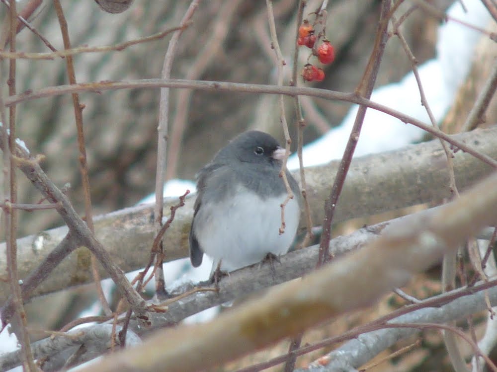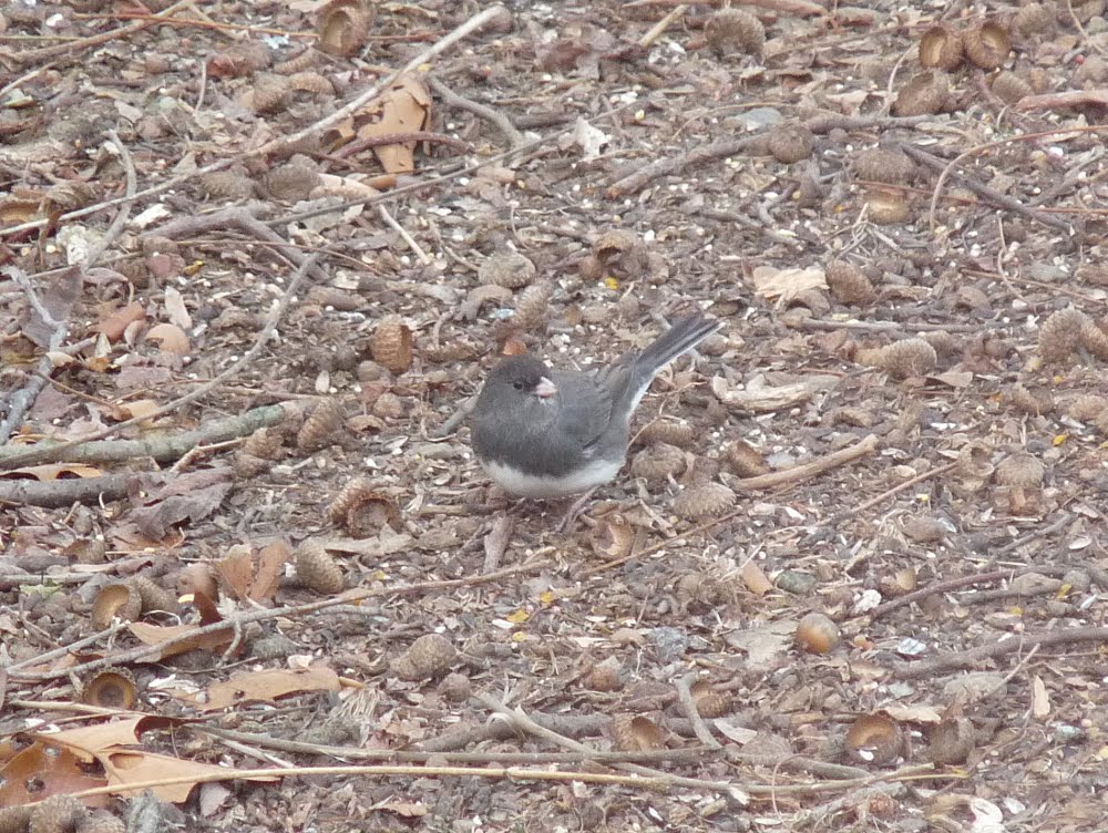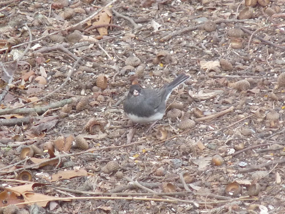 The second bird was quite engrossing and more difficult to spot. If one were looking out the window at their feeders, they would never notice it. Even if you were counting each individual of the species, you would very likely not see it. However, I was looking specifically for juncos with pale throats with my 10 power binoculars.