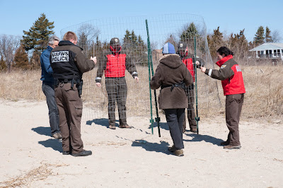 In the picture above, USFWS Refuge Manager Rick Potvin is explaining some of the logistics of working on Milford Point to his audience. Meanwhile, USFWS staff had placed two plastic eggs on the beach nearby to simulate a Piping Plover nest with its well-camouflaged eggs.