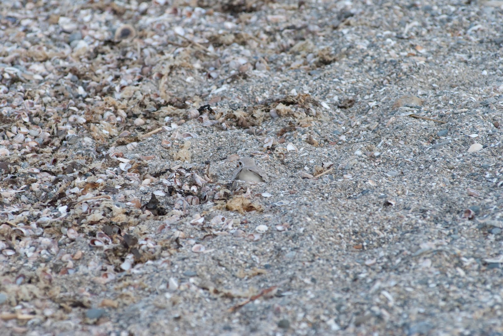 Piping Plover monitors work with USFWS and DEP to observe and collect data on nesting plovers and chicks on several beaches in Fairfield and New Haven counties. Piping Plover monitors also provide an important educational function when they interact with the public on the nesting beaches. Often people are unaware of the presence of these at-risk species on their favorite beach, which is not entirely surprising since these birds are generally relatively rare and also because they are extremely adept at making themselves hard to notice. Can you spot the nesting Piping Plover in the picture below?