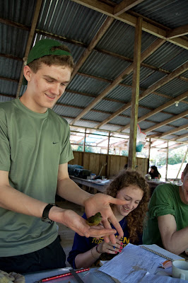 This year’s bird team, consisted of students from all three high schools involved: Faye Curran from Wamogo Regional High School, Christopher Moran from the Forman School, and Matt Markelon from Litchfield High School. Our team was able to net in different habitats than previous groups. Not surprisingly, we caught several species new to our cumulative list, which now stands at 1015 individuals of 98 species. We added nine species, the highest number since 2006, including the incredible Royal Flycatcher, and the impressive Blue-black Grosbeak, which has a bill rivaling that of an Evening Grosbeak. (Yes, they bite!)