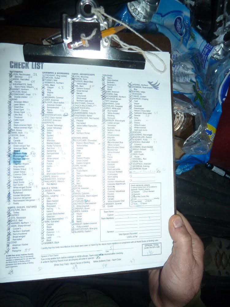 The words of Coastal Center Director Frank Gallo on the topic of our Raven Luna-ticks amazing journey into history on Friday, May 20. Frank mentioned that the 190s were in their sights in this blog entry on the Connecticut Big Day Birding Challenge 2011. They did it, and that historic species total further helped fundraising efforts for the CAS Coastal Center. Look for a complete write-up on their crazy day soon. For now, here’s a couple photos of the now-legendary tally sheet and an ecstatic team after an epic day across Connecticut.