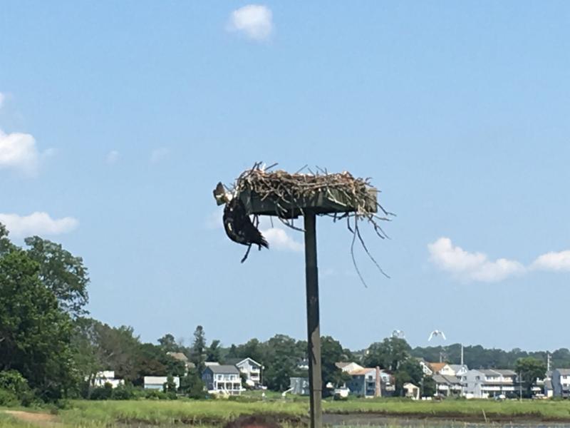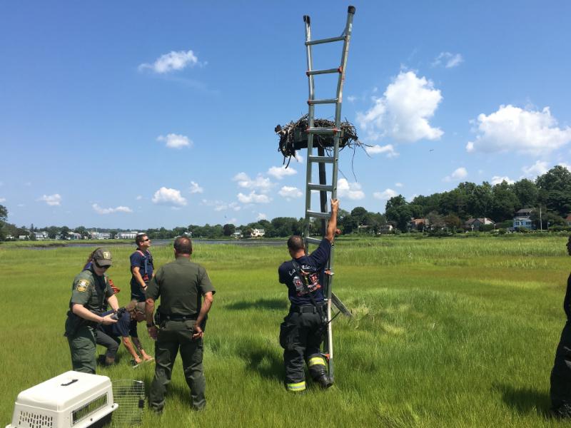 August 6, 2018 – Almost a dozen people spent their Sunday afternoon trying to save an Osprey that was dangling from its nest, caught on fishing line on the Ash Creek salt marsh in the Black Rock section of Bridgeport, on the Fairfield border. It was a hot afternoon of hard work, and not a happy ending.