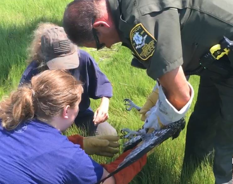 By 12:05 PM the Bridgeport Fire Department had set up the ladder and Betsy of Christine’s Critters had climbed up to the nest and was able to cut the fishing line to free the osprey. Christine was on the ground and examined the young bird with the help of DEEP Officer Hays. The raptor had a rope embedded in her leg as well as being caught up in fishing line. Christine and Betsy brought the young female osprey to a vet in North Haven. He had lost a lot of blood, but as you can see from the photo above, she was still alert when she arrived at the vet.