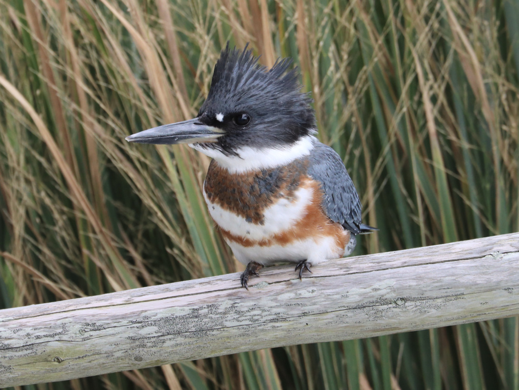 What it looks like: A mostly blue-colored bird with a large bill and a tufted crest on its head. The males have white and blue on their neck and breast, while the females have an additional reddish-brown belly band. The kingfisher is one of the few bird species where the female is more colorful than the male. Its presence is often known by the distinctive rattle call it makes while flying.