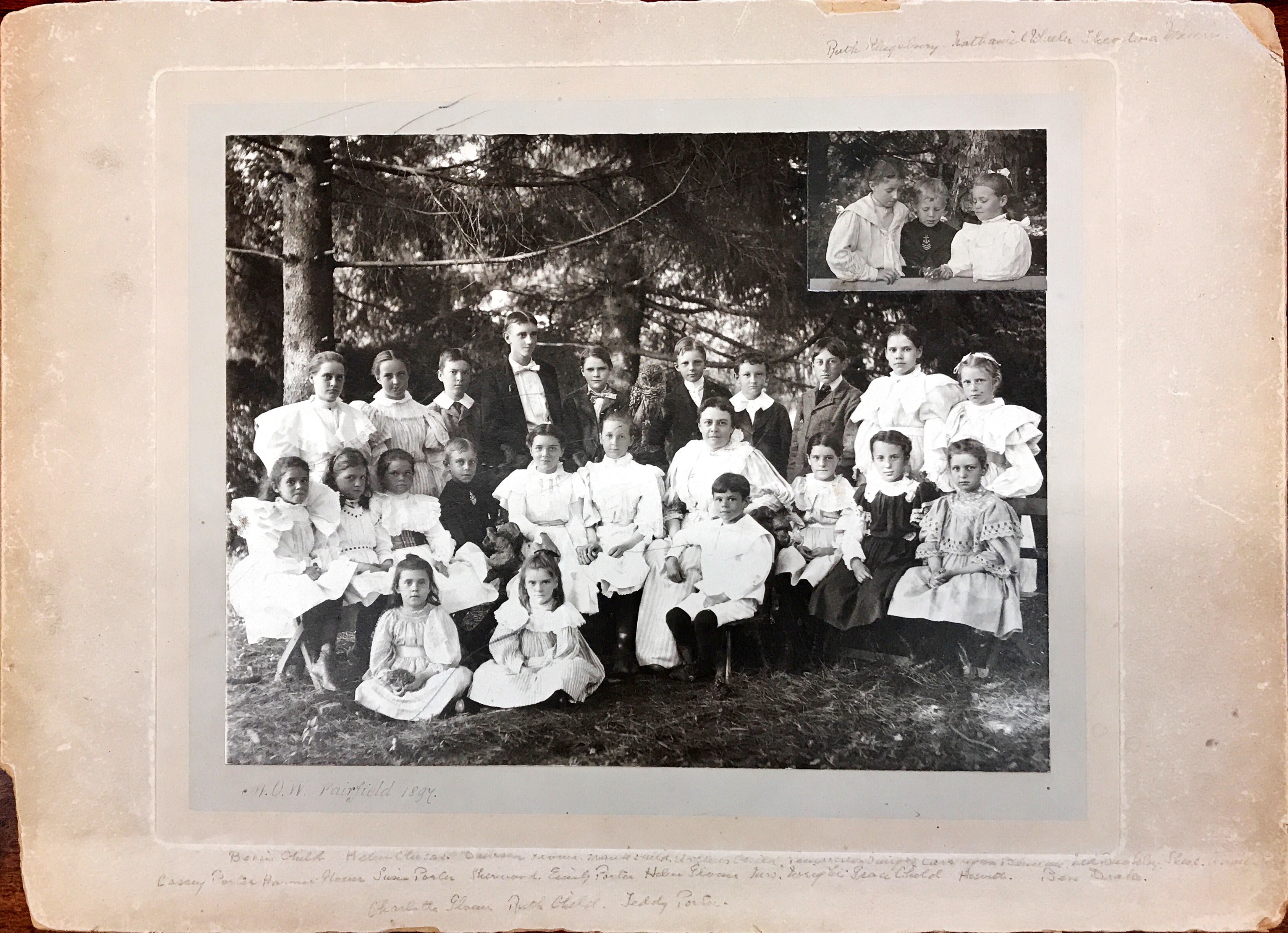 This 1897 photo is of 26 children who were part of a “bird study group” in Fairfield, probably six or so months before the first official meeting of the Audubon Society of the State of Connecticut. Mabel Osgood Wright is sitting in the middle row, fourth from the right. The boy behind her is holding a Barred Owl, perhaps a texidermid specimen borrowed from Frank Chapman at the American Museum of Natural History. Inscribed at the bottom is “M.O.W. Fairfield 1897” and the names of all the children.