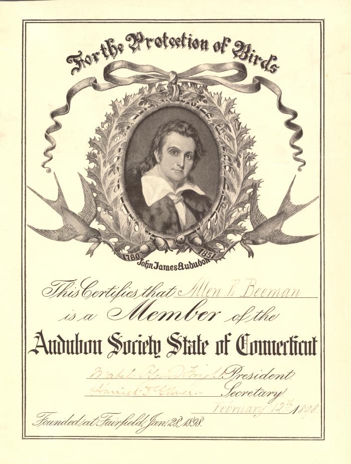 A membership certificate dated February 12th, 1898, for Allen Beeman, signed by Mabel Osgood Wright, President, and Harriet S. Glover, Secretary. The Rev. Beeman was the long-time rector of St. Paul’s Church in Fairfield. The records of the first two meetings list only women as being in attendance. He was at the third and was one of the first men to become a member of the Connecticut Audubon Society. From the Fairfield Museum and History Center.