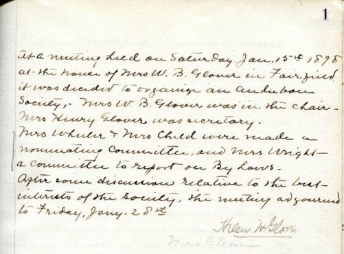 The minutes of that meeting, 58 words in all, include this sentence: “At a meeting held on Saturday Jan 15th 1898 at the house of Mrs. W.B. Glover in Fairfield it was decided to organize an Audubon Society.”