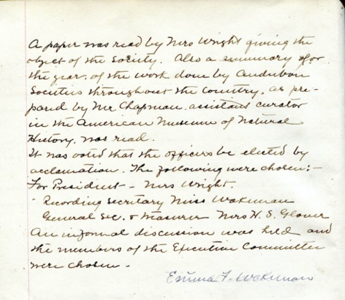 The January 28 minutes also refer to a “summary of the year of the work done by Audubon Societies throughout the country, as prepared by Mr. Chapman, assistant curator in the American Museum of Natural History.” Chapman was 33 years old, already an important figure in American ornithology. The phrasing of the minutes makes it sound as if he wasn’t at the first meeting, but he did participate in subsequent meetings and was a lifelong friend of Mabel Osgood Wright.