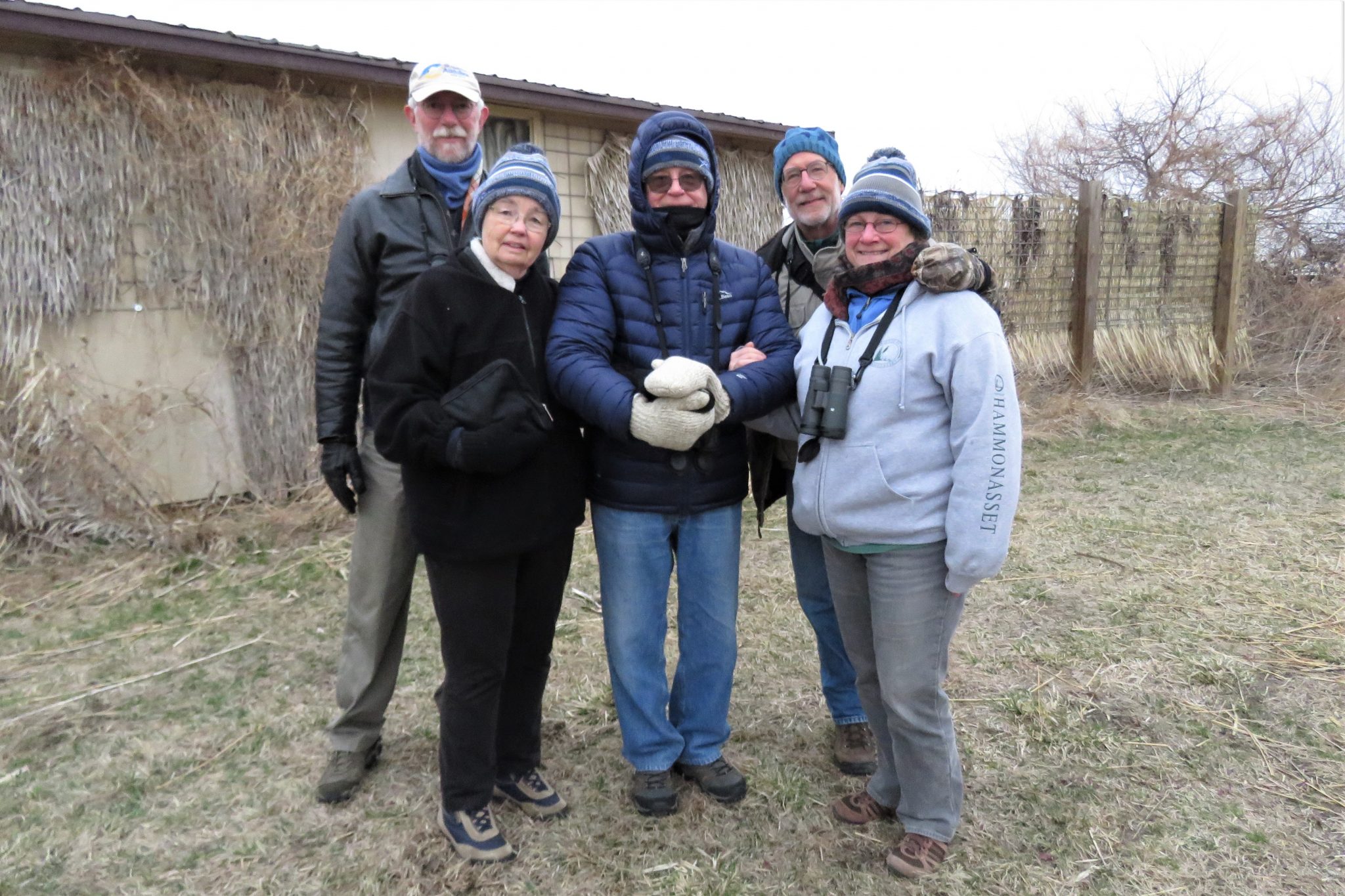 The EcoTravel group outside the blind at the Rowe Sanctuary. Yes, it was that cold. From left, Tom Andersen, Betsy Craggs, Jay Coles, Jim Sherwonit, Jan Hamilton-Sherwonit.