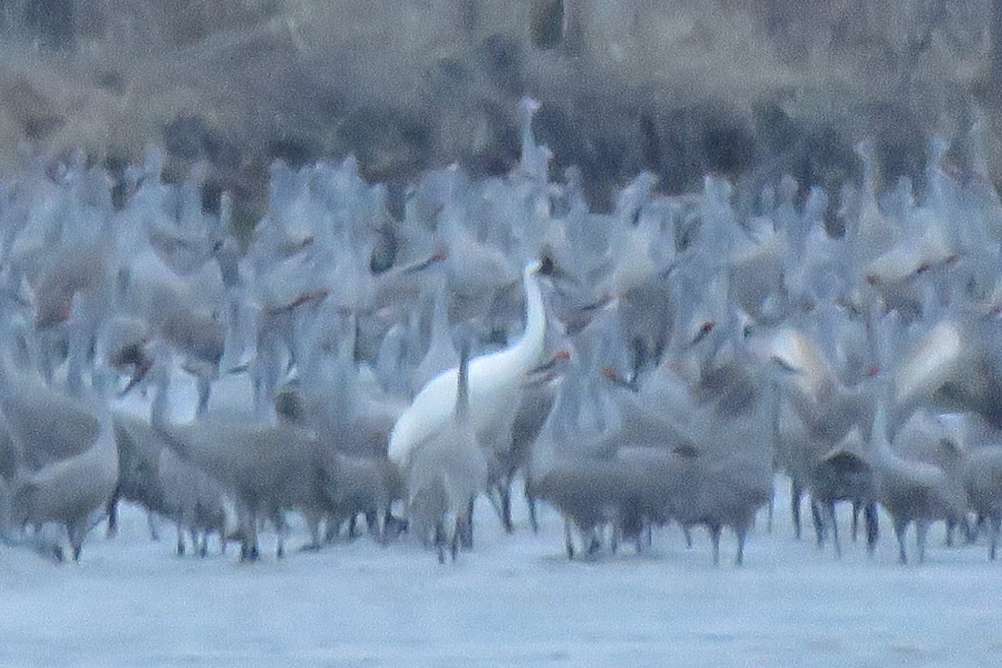 Word comes from the end of the blind, where Jim, Betsy, Jay, and Jan are stationed: Whooping Crane. It’s like an electric charge through the blind – muffled because one of the rules of the blind is no talking except in whispers. I scan a long thick line of Sandhill Cranes down the river until I find a big white bird, first in my binoculars and then in a scope mounted near the opening. A Whooping Crane, dwarfing the Sandhills it’s with. Perhaps 1,500 yards away.