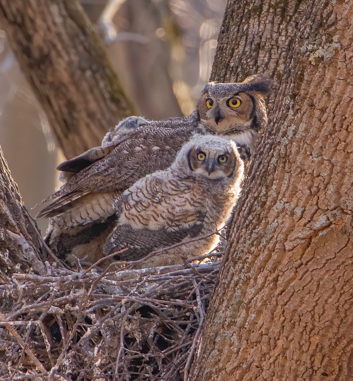 In spring, Great Horned Owls will have fledglings or at least be on nest. It is important to give these birds space and use discretion when posting the location of owls so as not to bring in crowds of people that may cause unnecessary stress on the birds.