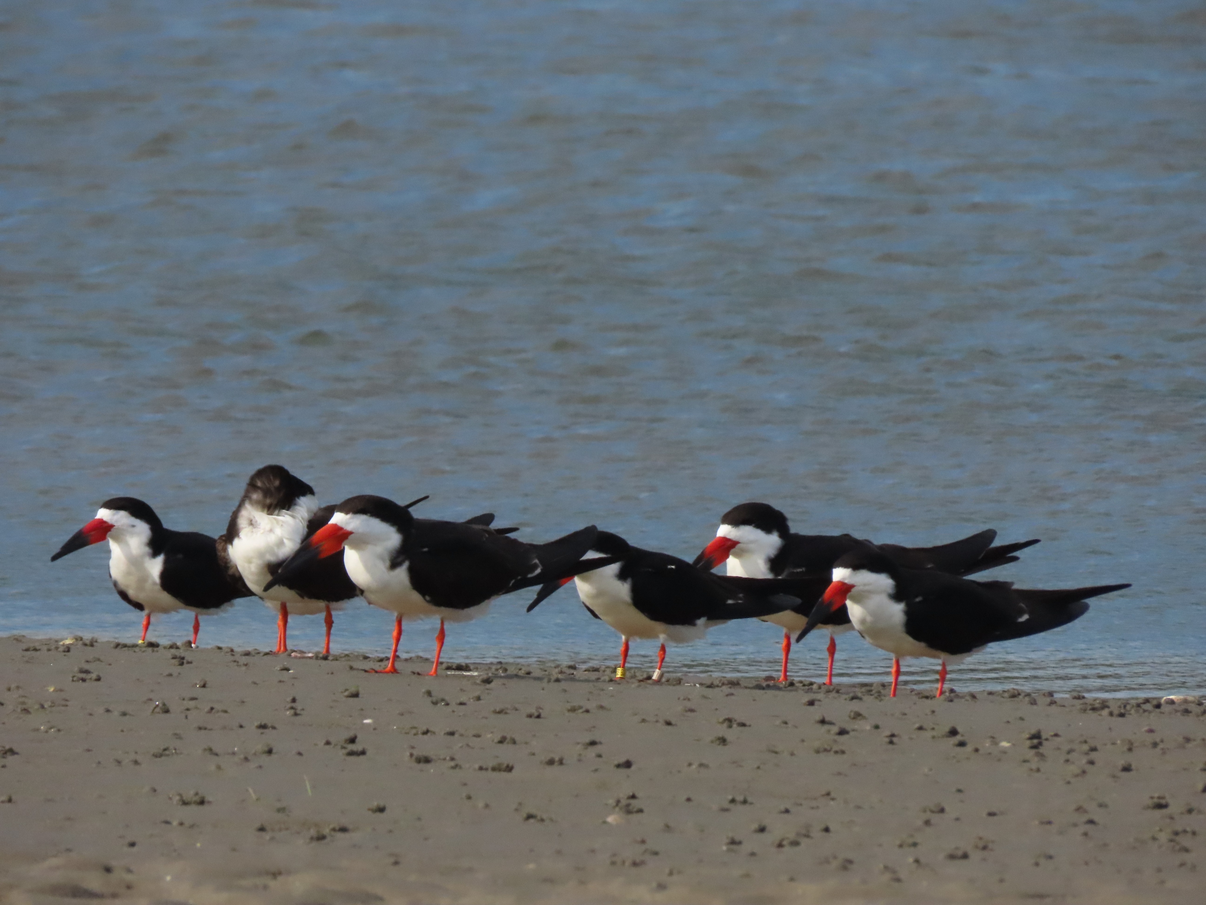 Skimmers are fairly good-sized birds, about 17 inches long, and are generally grouped together. When at rest, they often perch on sand and gravel bars, their black backs and white underparts visible at long distances. So scan the offshore bars for a small group of larger black and white birds sitting on the sand.
