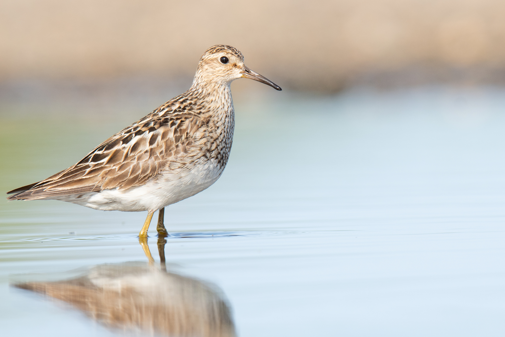 The Pectoral fits the basic plumage pattern, but it’s larger with yellow legs and a distinctive brown-streaked breast pattern that cuts off sharply to create a demarcation between breast and belly. Least Sandpipers are mainly brown with yellow legs, but they’re the smallest of the “peeps,” six inches to the Pectoral’s eight-plus. In spring migration the largest “peep” — White-rumped Sandpiper — can show a similar breast pattern, but it is most common mid-May to early June while the Pectorals are mostly gone by early May. Of course other features such as the rump pattern easily separate them.