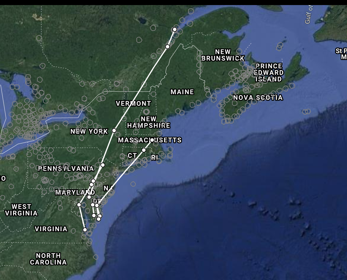 This Motus map shows the route taken by a Rusty Blackbird fitted with a transmitter in Canada on October 2, 2020. It was detected by the new antennas at the Center at Pomfret more than a year later, on October 24, 2021.