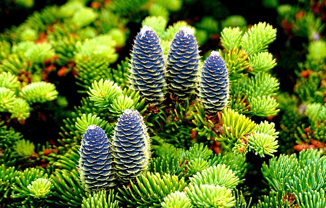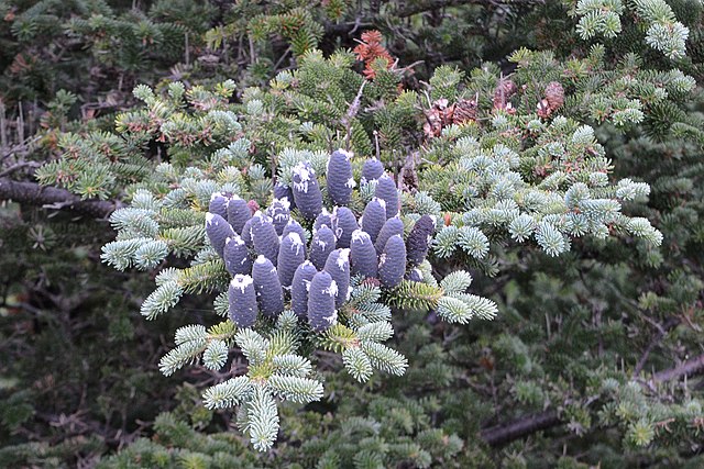 Balsam fir cones are unusual because they stand up like candles instead of dangling downward. The young cones are blue. Photo by Wallace Howe from Canada – Family Road Trip to Newfoundland July 12th-28th 2017, CC BY-SA 2.0, https://commons.wikimedia.org/w/index.php?curid=80252232