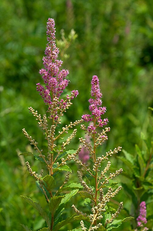 Spiraea tomentosa is native from Nova Scotia south to Louisiana and Georgia. The tall flower spires have a similar form to those of meadowsweet, but they are bright pink and bloom a bit later—August to September.