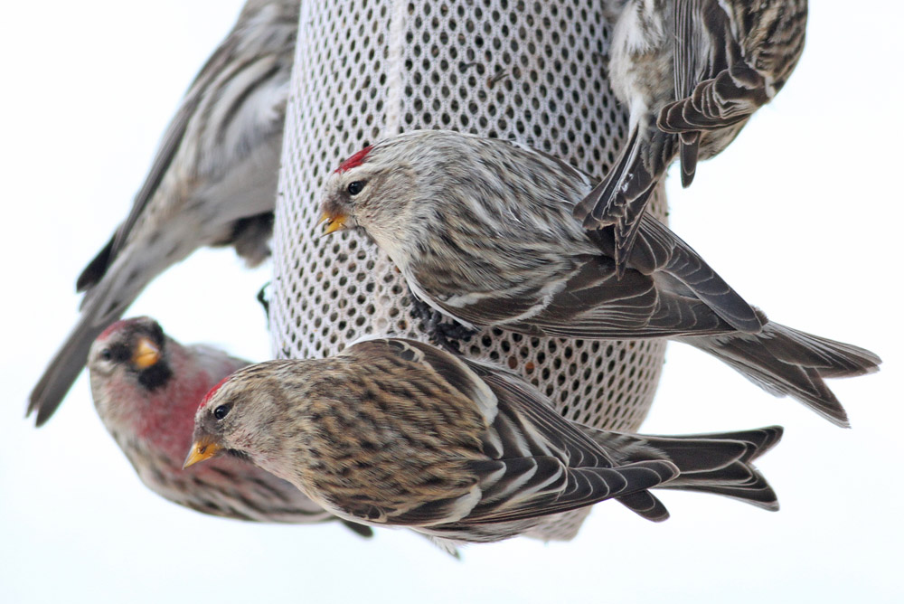 These redpolls are eating thistle, which is not a favorite foor of Black Bears. Photo by Nick Bonomo.