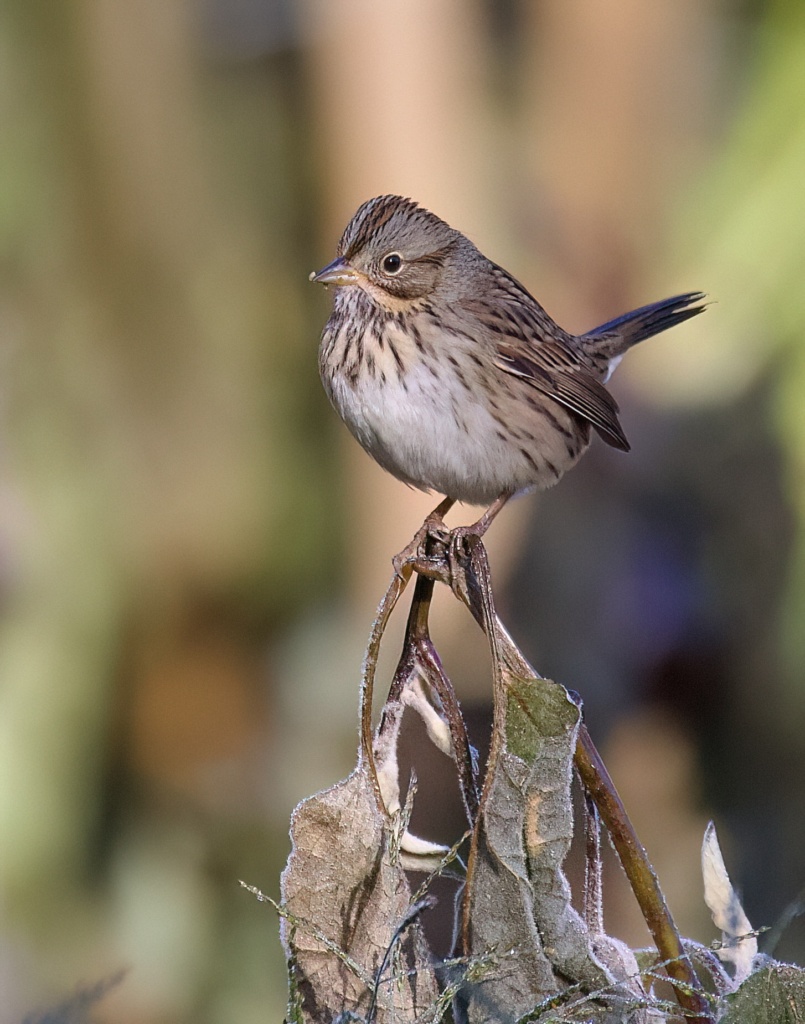 The bill appears narrow and sharply pointed for a sparrow. Its face is very strongly patterned and includes a gray supercilium and thin, buffy eye ring. But by far its most striking feature shows on its underside – a rich buff (not gray!) breast and flanks that are lined with crisp (there’s that word again!) blackish streaks. The belly is a contrasting clean white.