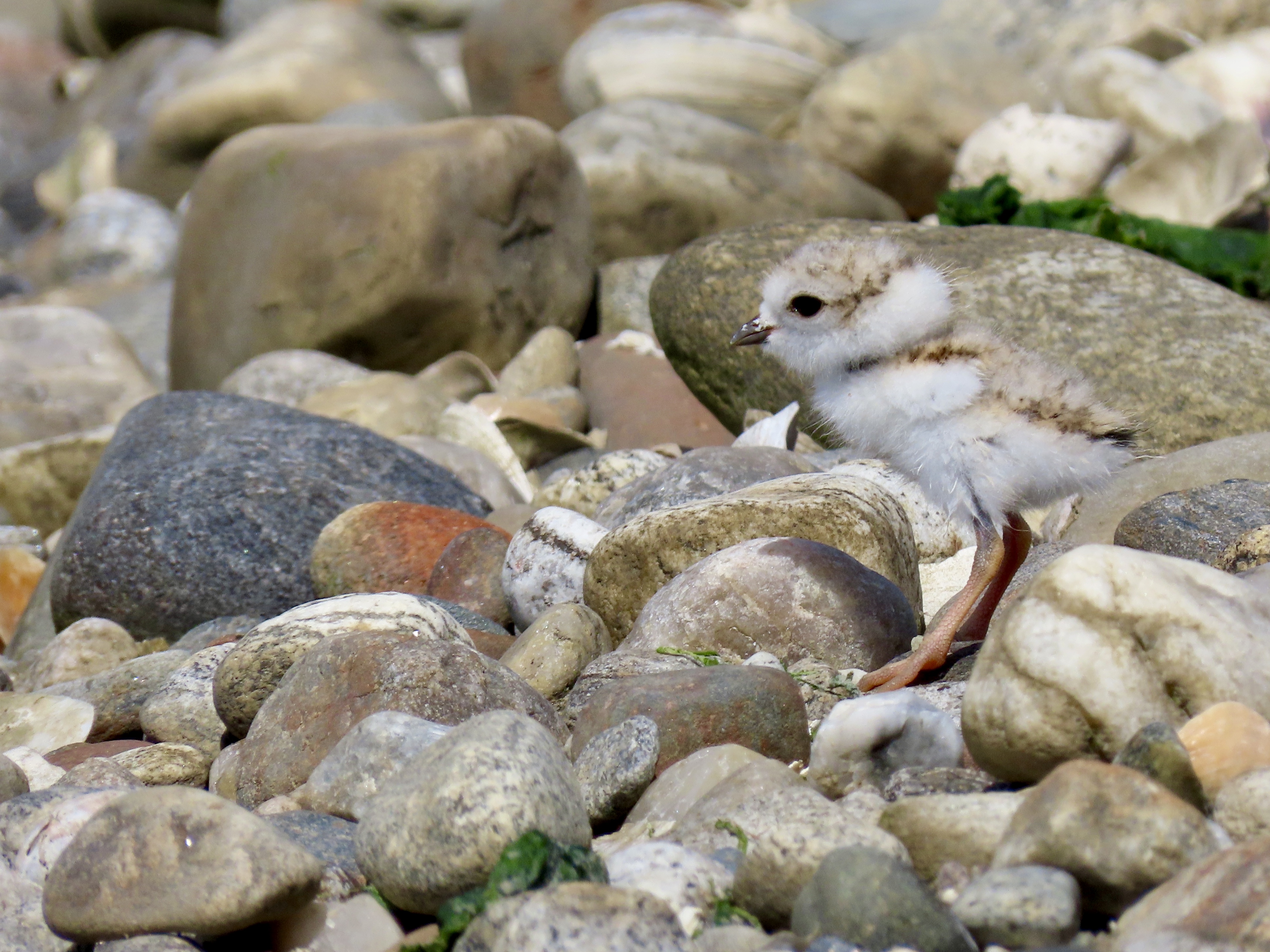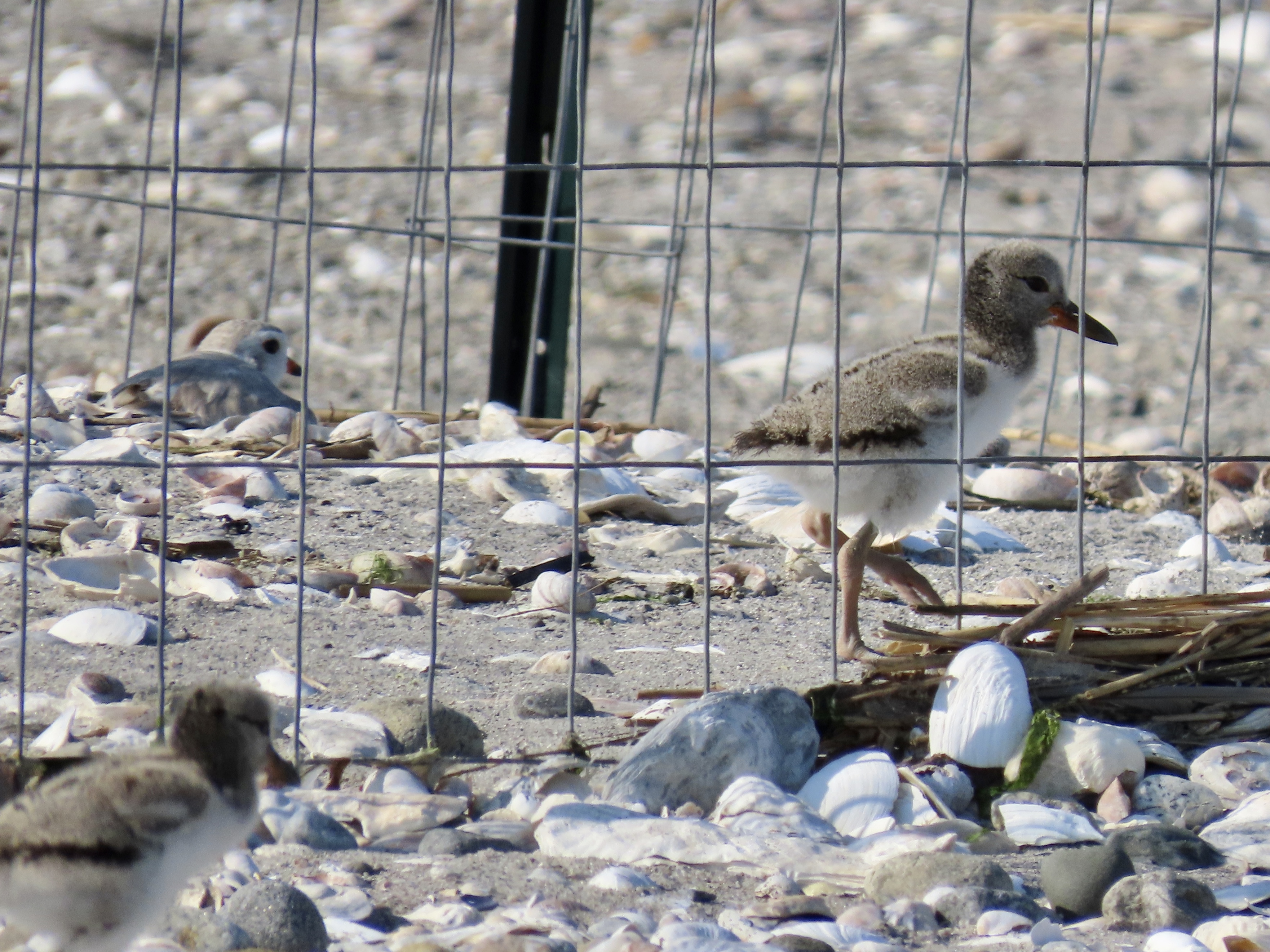 The good news is that as of this week, there is one Piping Plover pair at Milford Point incubating in a wire exclosure — a cage that lets the birds come and go but helps stop raccoons, skunks, foxes, and other predators — and four plover pairs with chicks. Three of those pairs hatched within a three-day span. Eggs from a sixth nest hatched earlier.