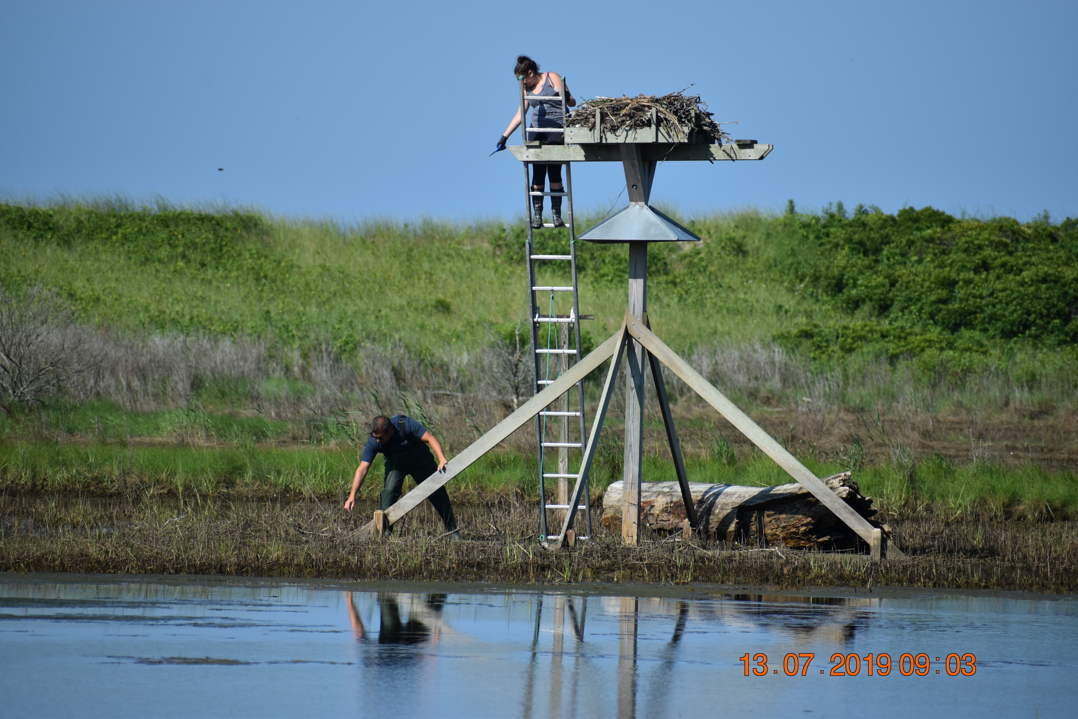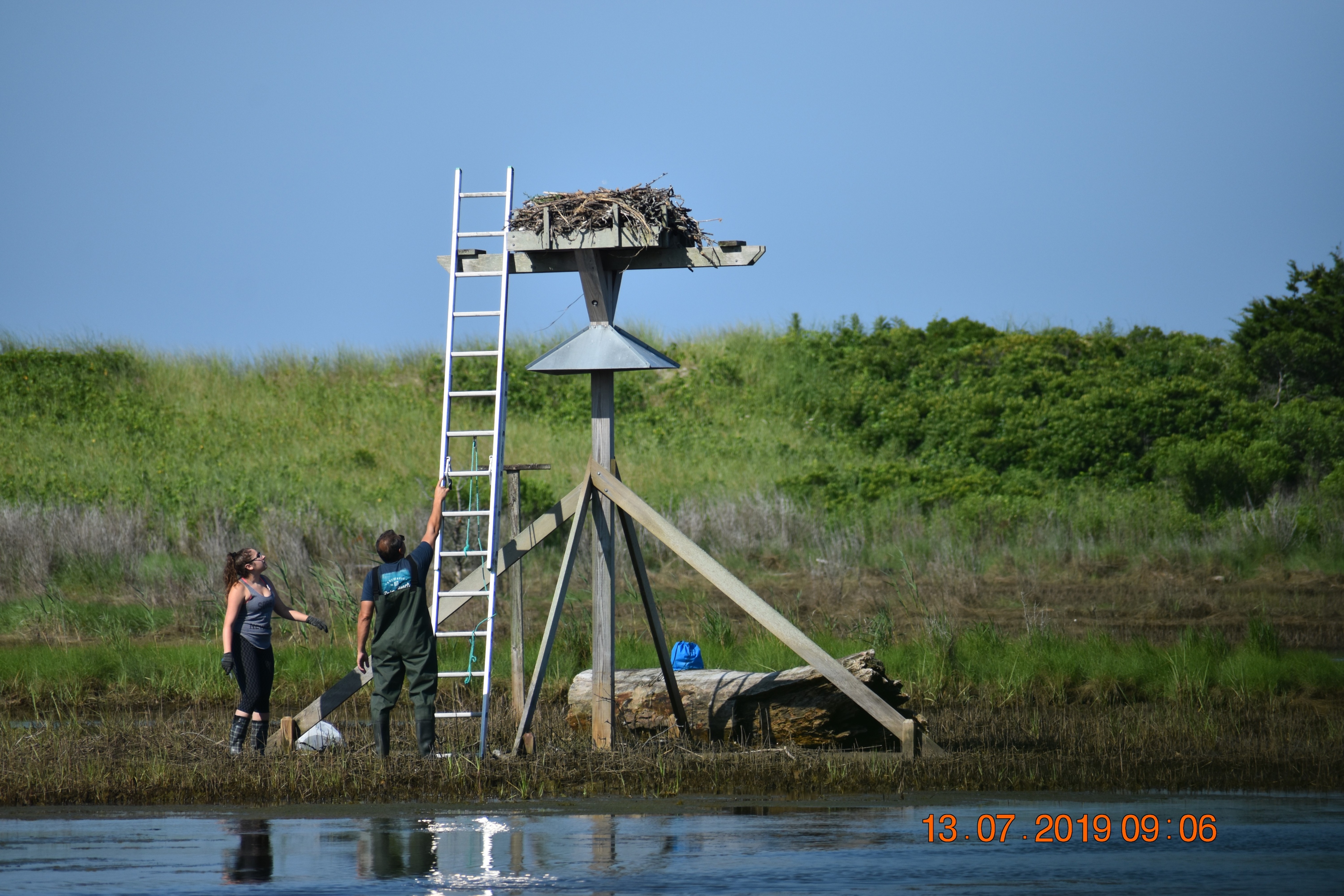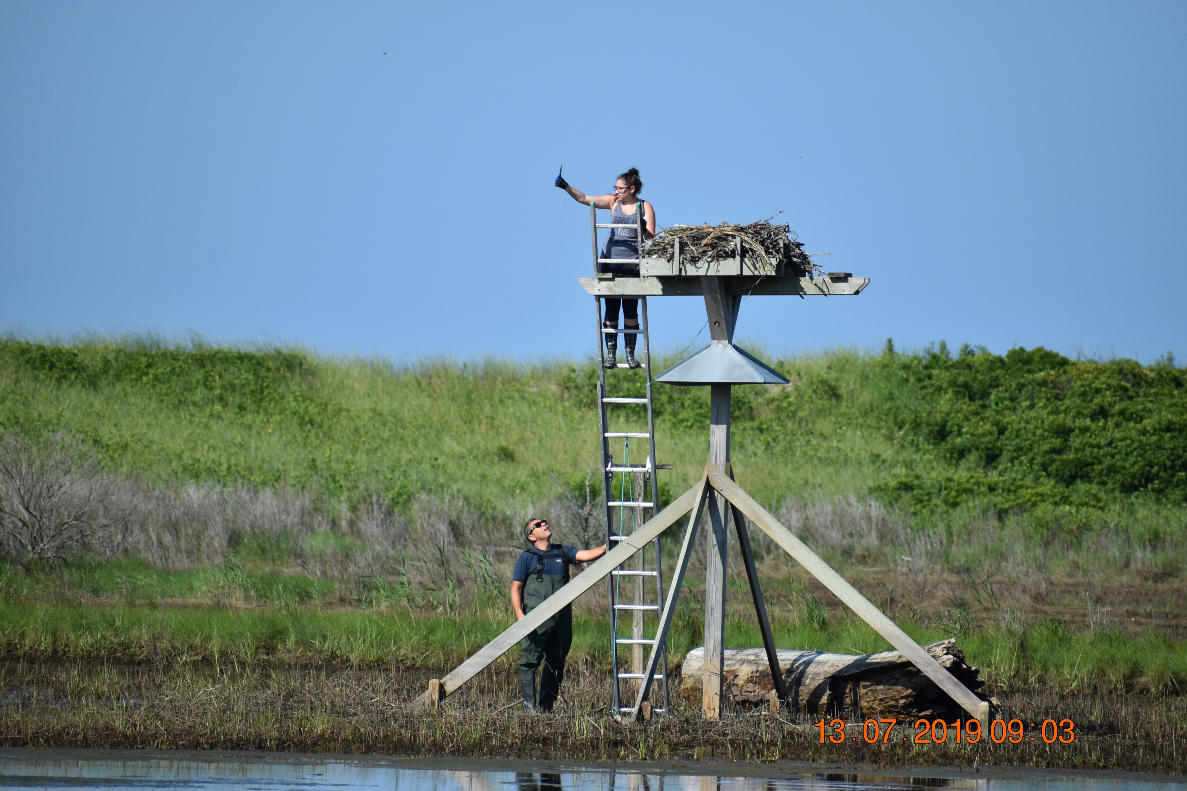 Like the other Osprey Nation volunteers, Nancy monitors her nests a few times each month and sends the data to Melina. She and Melina exchanged messages and spoke on the phone about what Nancy had seen at Harkness. Melina asked her father for help. “My father has a great understanding of what happens when fishing line is not disposed of properly and that this is a great threat to wildlife,” Melina said. “I convinced him by explaining the situation and proposing a game plan as to what we would be doing/how to go about it.”