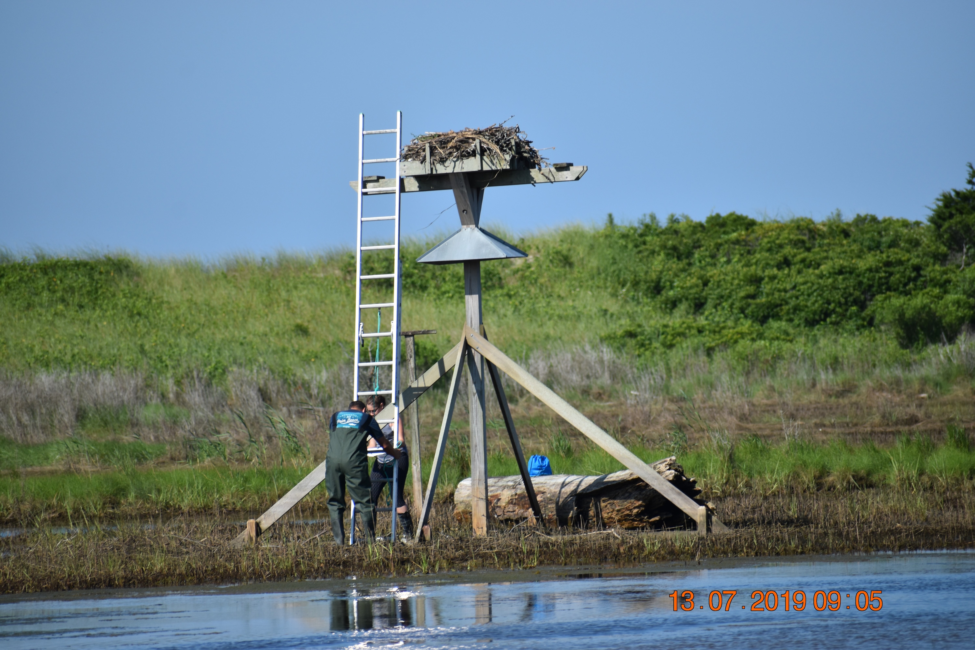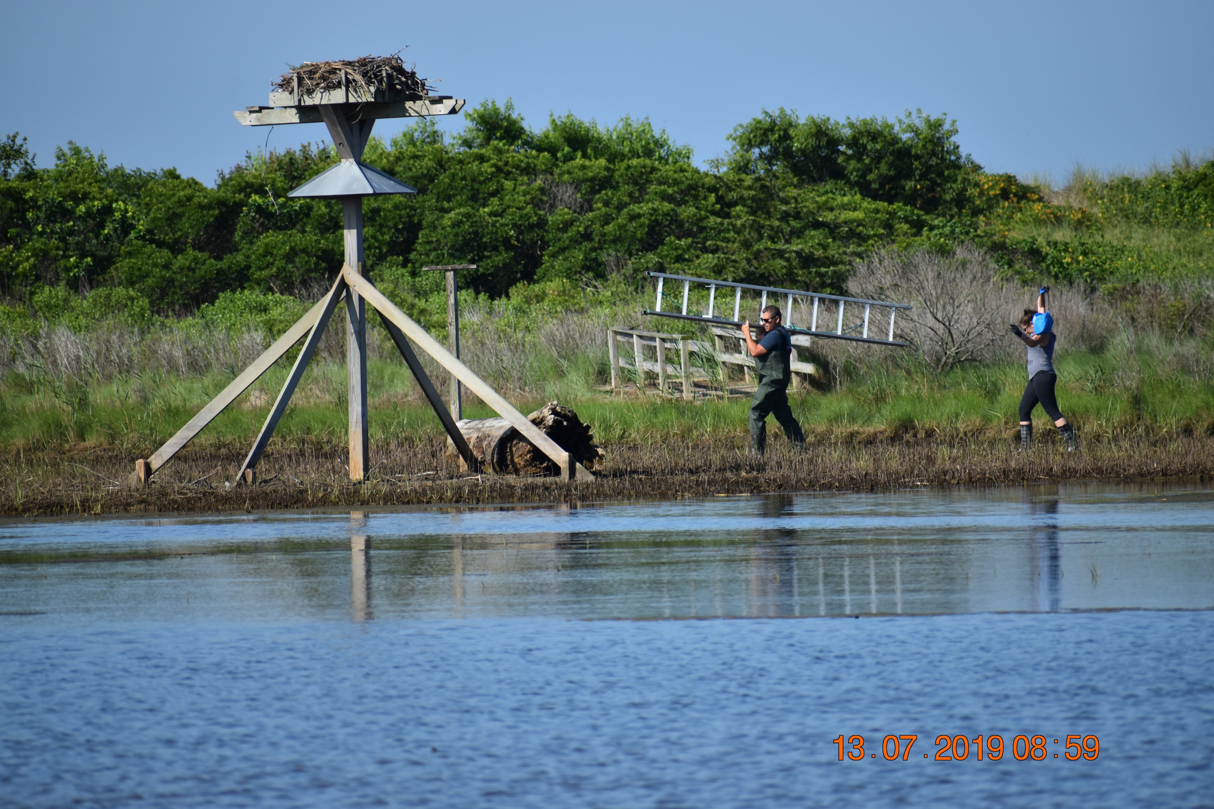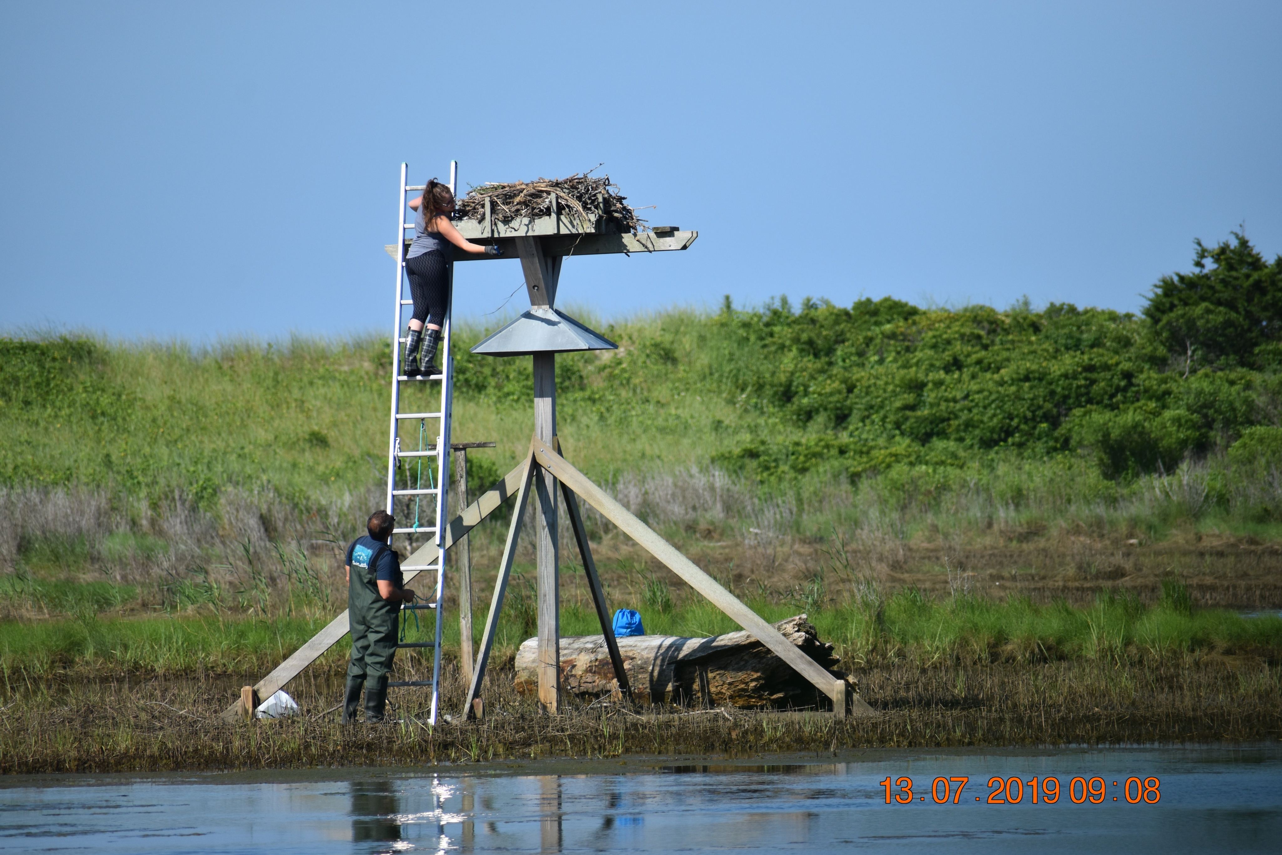Like the other Osprey Nation volunteers, Nancy monitors her nests a few times each month and sends the data to Melina. She and Melina exchanged messages and spoke on the phone about what Nancy had seen at Harkness. Melina asked her father for help. “My father has a great understanding of what happens when fishing line is not disposed of properly and that this is a great threat to wildlife,” Melina said. “I convinced him by explaining the situation and proposing a game plan as to what we would be doing/how to go about it.”
