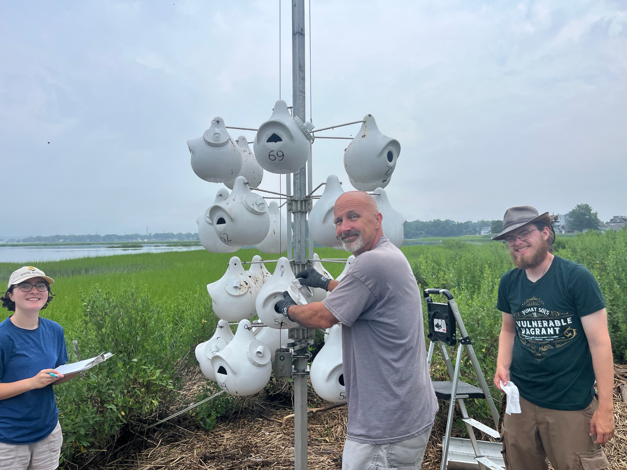 Volunteers Katherine Murray, left, and Tom Murray, and Coastal Ranger Johann Heupel checking Purple Martin gourds on a hazy July 5th. The team leader, Frank Mantlik, took the photo.