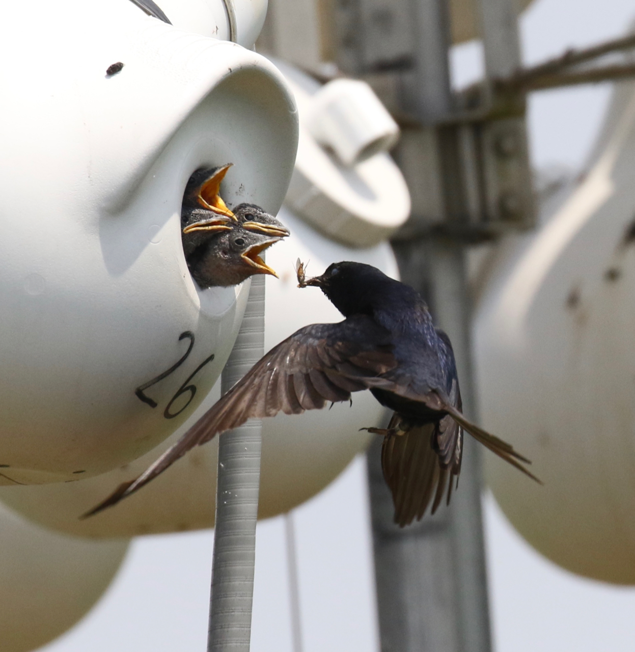 An adult Purple Martin offers food to its hungry offspring in early July at the Milford Point Coastal Center. The 4 young birds were among 176 hatchlings counted that day. Photo by Frank Mantlik.
