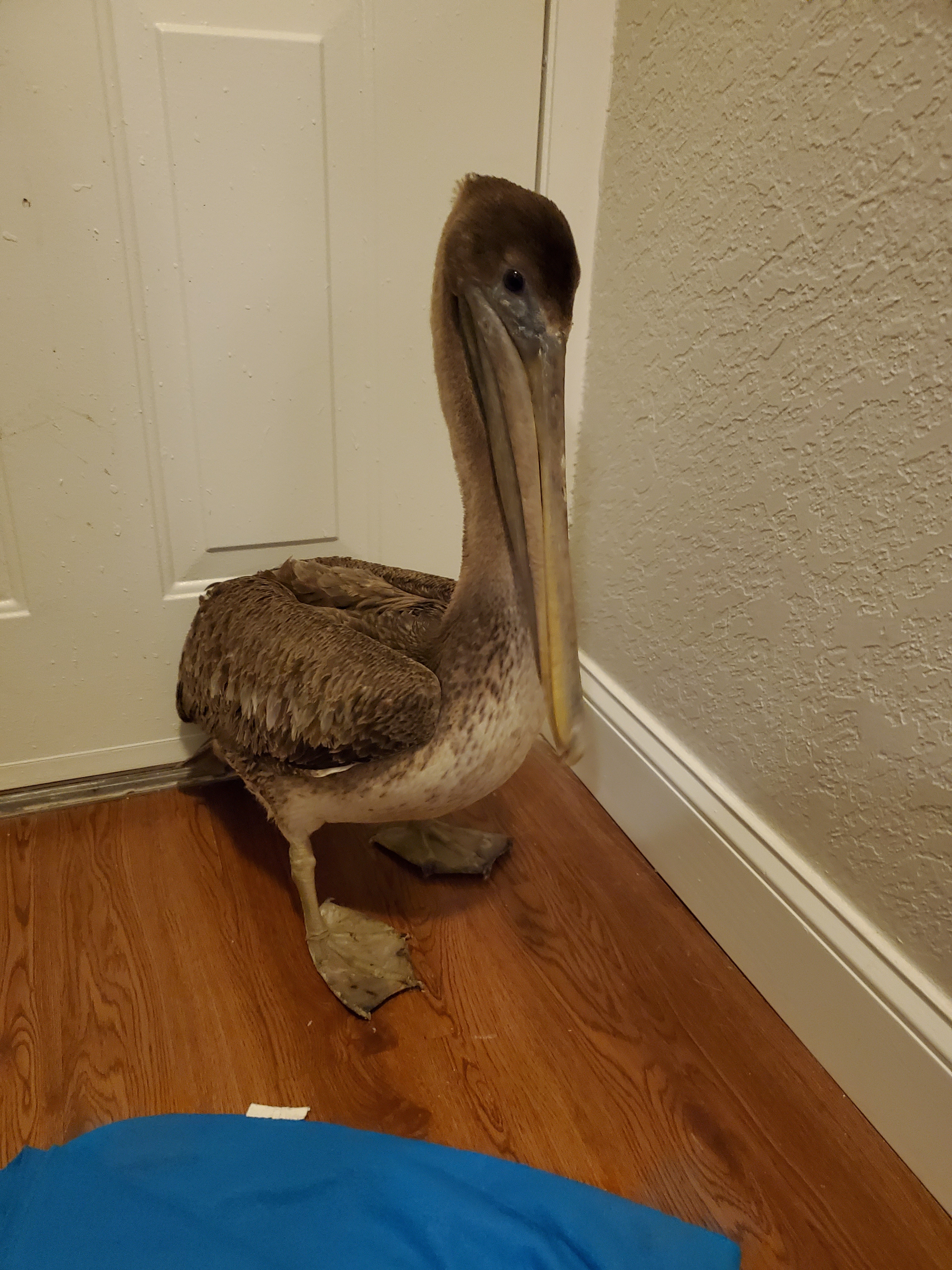 The Brown Pelican rescued in Essex is being cared for indoors for the time being and will eventually be moved to an outdoor aviary so it can test its wings. Photo courtesy of the Busch Wildlife Center.