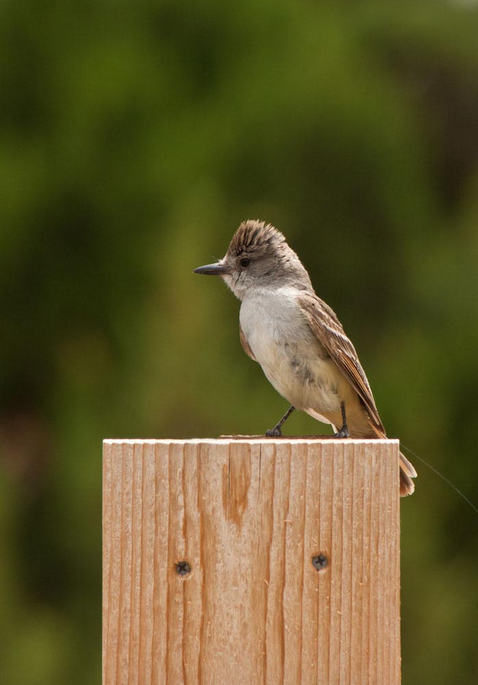 This is one of North America’s four resident flycatchers in the genus Myiarchus. The only species resident in Connecticut is the familiar Great Crested Flycatcher. All of the genus members are similar in pattern, with yellow bellies and varying amounts of rufous in the wings and tail. In comparison to the Great Crested, the Ash-throated is somewhat smaller with a smaller bill, paler yellow underparts and ashy gray tones on the throat and breast.