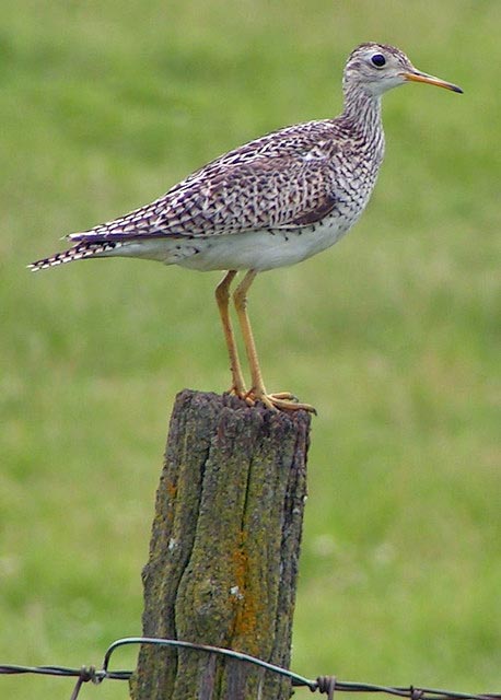 What it looks like: The Upland Sandpiper is a medium-sized shorebird, about the size of a Greater Yellowlegs. Note the species’ pot-bellied shape with small dove-like head, large black eye, thin neck, long legs and tail. This makes for an awkward appearance, but its movements are deliberate and graceful.