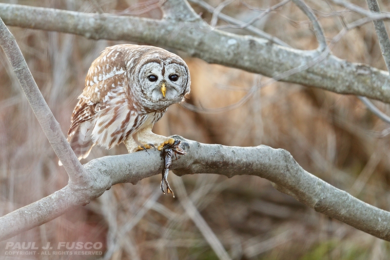 Paul J. Fusco contributed this recent photo of a Barred Owl eating a wood frog on an unusually warm winter day.