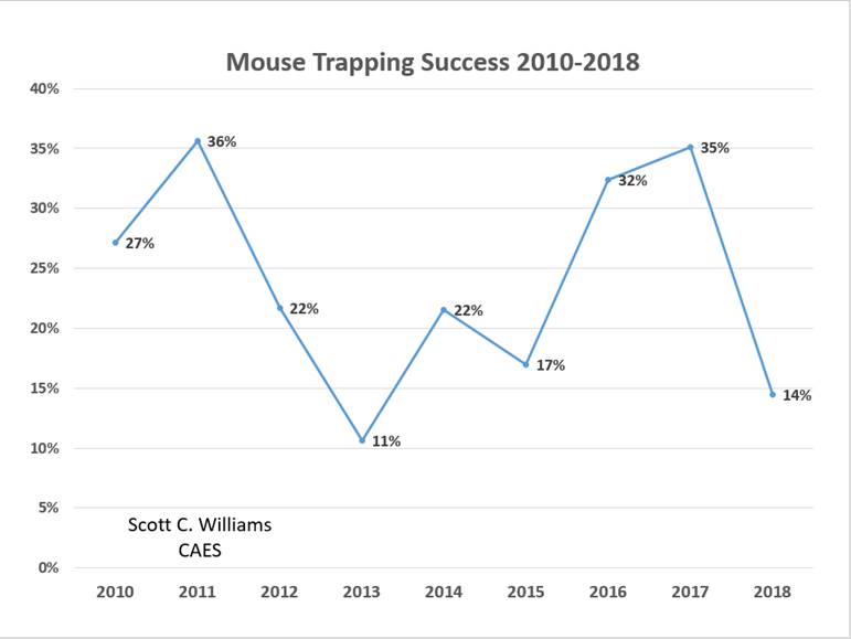 “The graph (right) is based on our trapping effort, which has been pretty substantial, netting us a low of 314 captured mice in 2013 to a high of 1003 in 2016. Anyway, thought you might be interested. Feel free to circulate. “Success” is defined at the mice caught/trap night. For instance in 2017, we had 797 mouse captures over 2,268 trap nights = 35%.